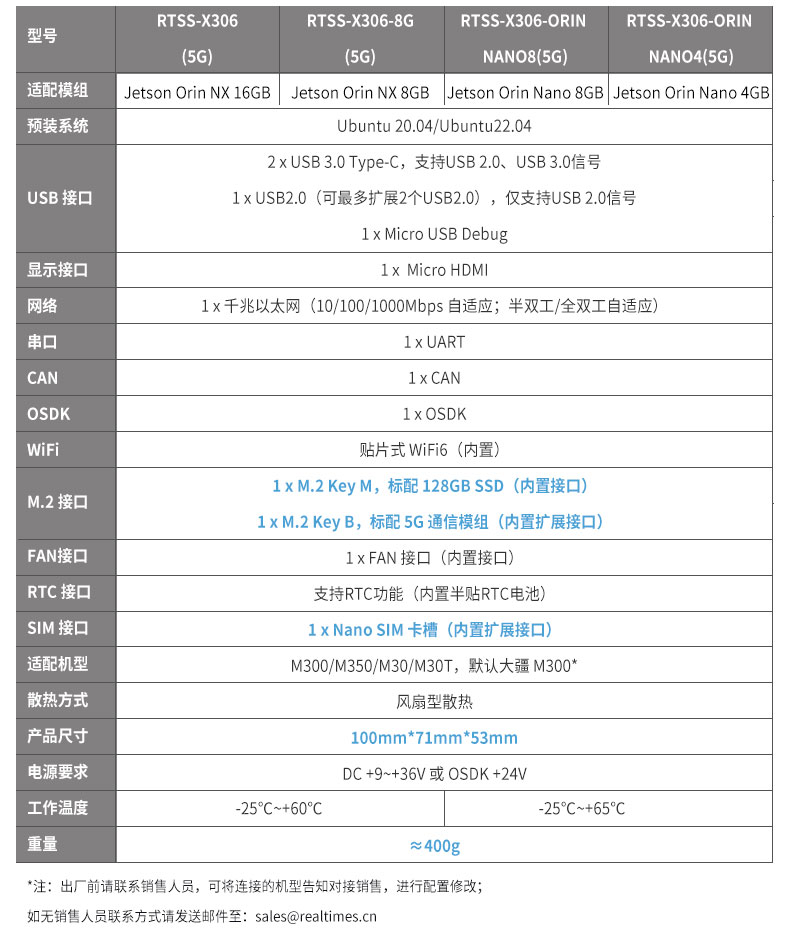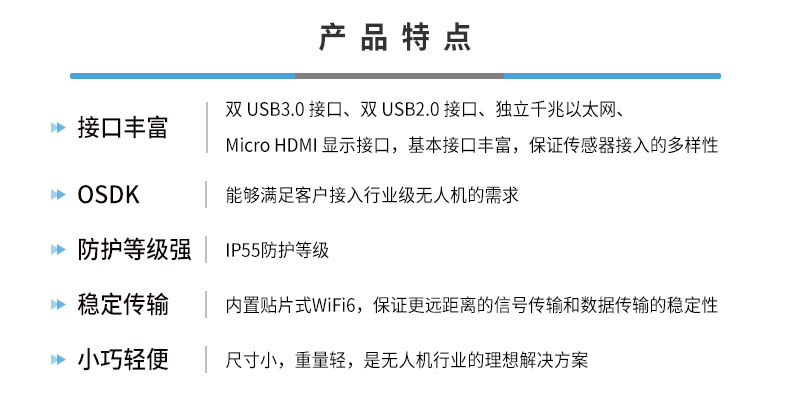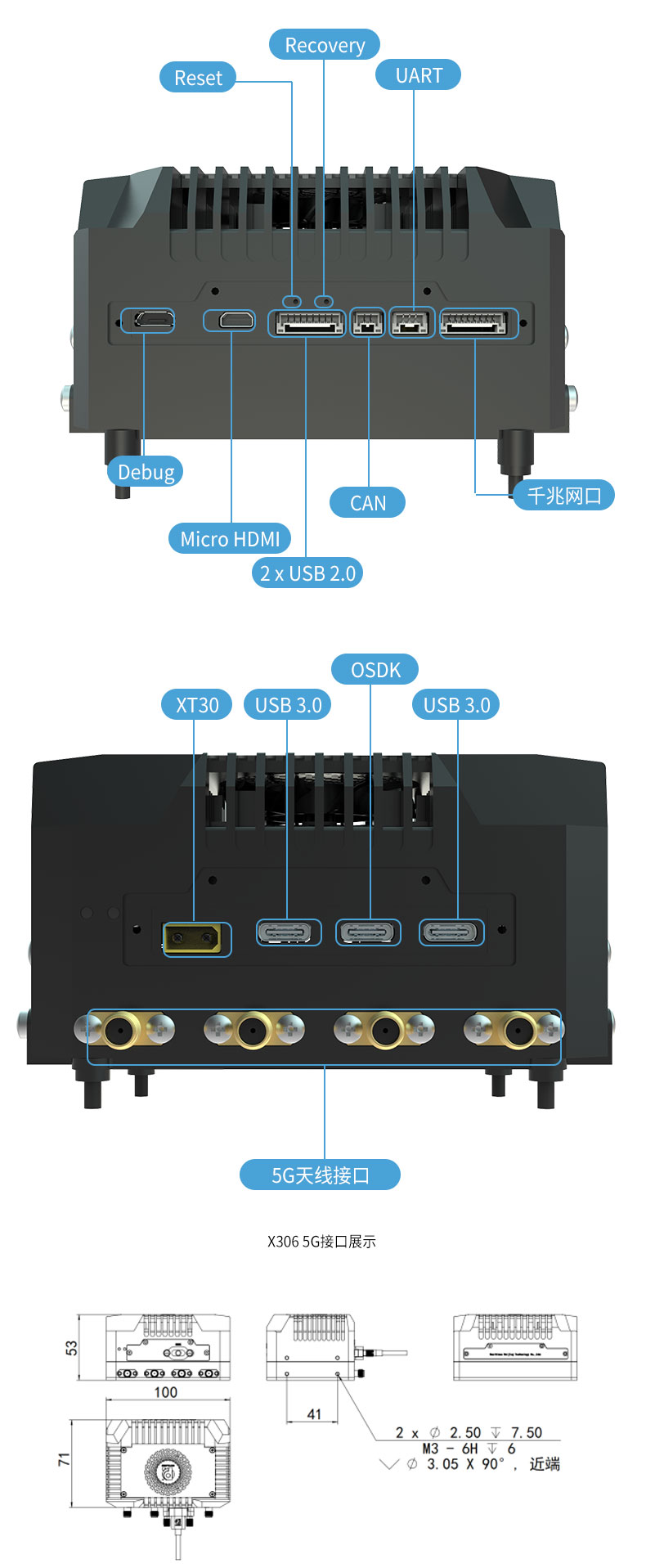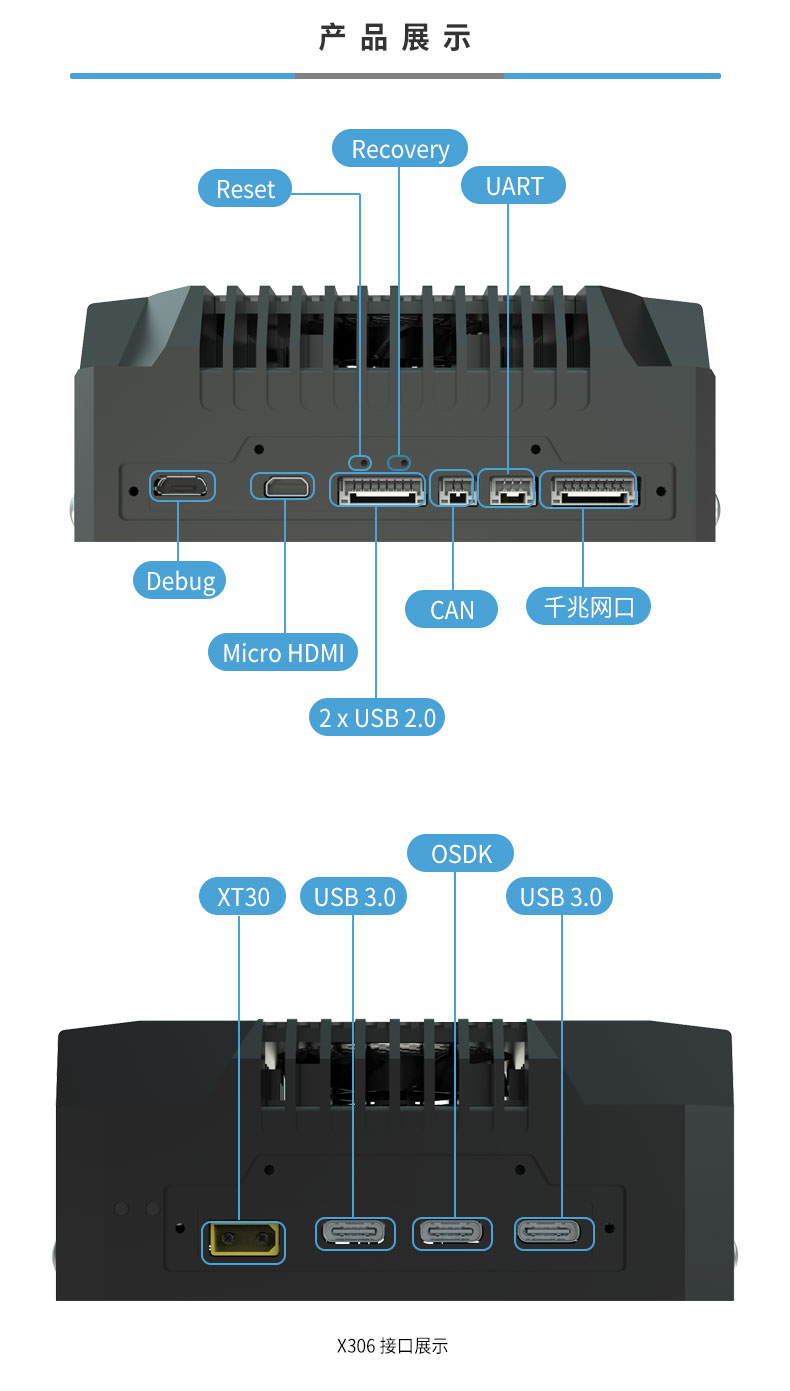 • 产品描述:飞云智盒 RTSS-X306 是NVIDIA Jetson Orin NX和Orin Nano核心模组的无人机行业解决方案,支持Super模式,采用铝合金外壳有源散热,能够适应更加恶劣的工作环境,采用卡扣式端子座,保证无人机飞行过程中接口的稳固,丰富的接口保证传感器接入的多样性,OSDK 接口满足客户接入行业级无人机的需求,内置贴片式 WIFI6 模块,保证数据稳定交换,更远距离信号传输,是无人机行业的理想解决方案。